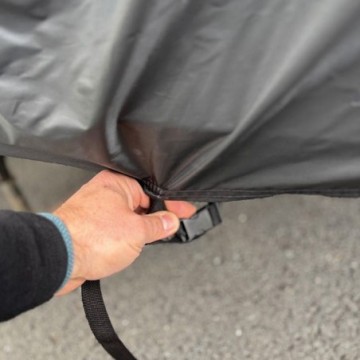 Afin de garantir une bonne tenue, une sangle de serrage avec clip se trouve sur la partie inférieure, à passer sous votre Bâche pour Kymco VISA. Ainsi, la bâche ne senvole pas et les élastiques intégrés aux roues avant et arrière complètent ce maintien. Une ouverture permet également la ventilation afin déviter la condensation sous la bâche et une encoche au niveau de la roue avant vous permettra dy insérer votre antivol (U ou chaine), une bonne protection contre le vol de bâche quand votre Bâche pour Kymco VISA est garée dans la rue. Dernier point, des bandes réfléchissantes garantissent sa visibilité la nuit pour éviter tout accident.