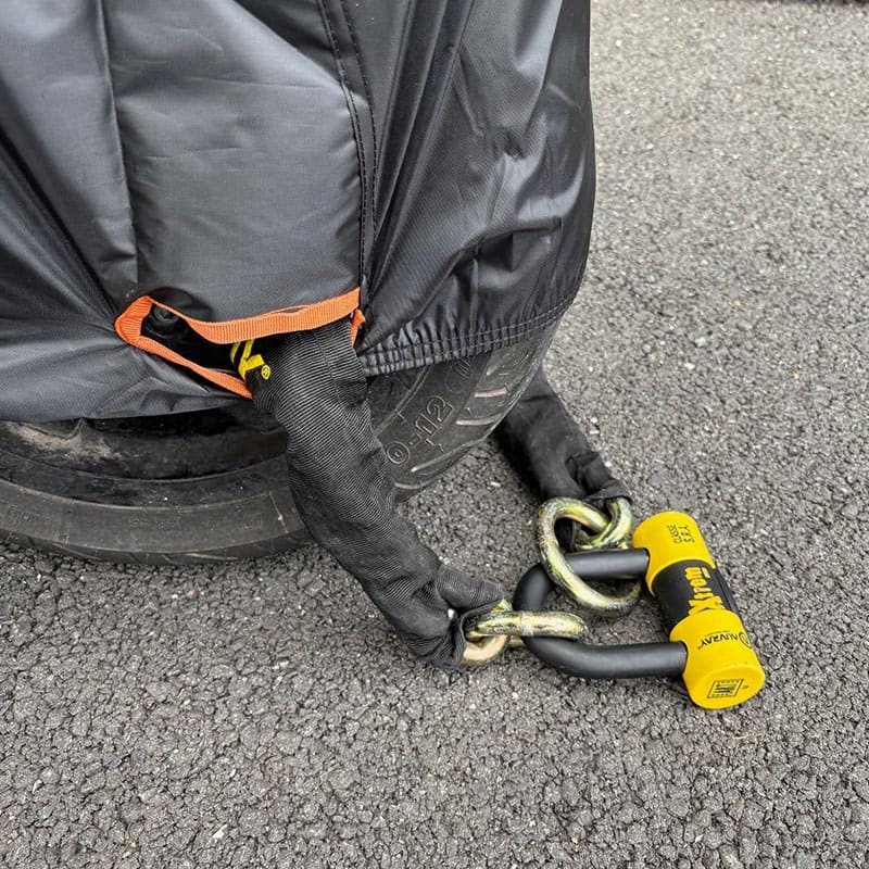 Afin de garantir une bonne tenue, une sangle de serrage avec clip se trouve sur la partie inférieure, à passer sous votre Bâche pour Peugeot NK7. Ainsi, la bâche ne senvole pas et les élastiques intégrés aux roues avant et arrière complètent ce maintien. Une ouverture permet également la ventilation afin déviter la condensation sous la bâche et une encoche au niveau de la roue avant vous permettra dy insérer votre antivol (U ou chaine), une bonne protection contre le vol de bâche quand votre Bâche pour Peugeot NK7 est garée dans la rue. Dernier point, des bandes réfléchissantes garantissent sa visibilité la nuit pour éviter tout accident.