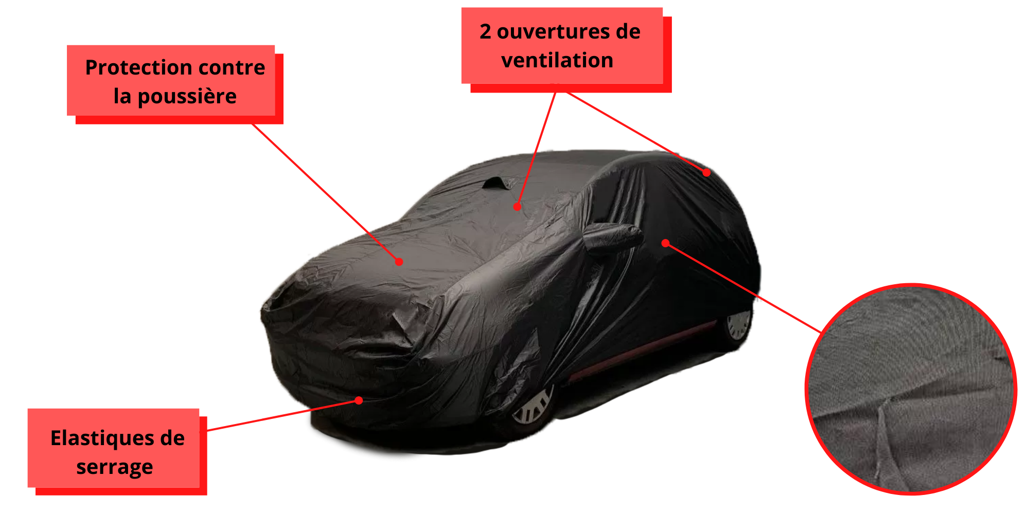 - La bâche possède des élastiques d’ajustements à l’avant et à l’arrière du véhicule afin de couvrir parfaitement la carrosserie